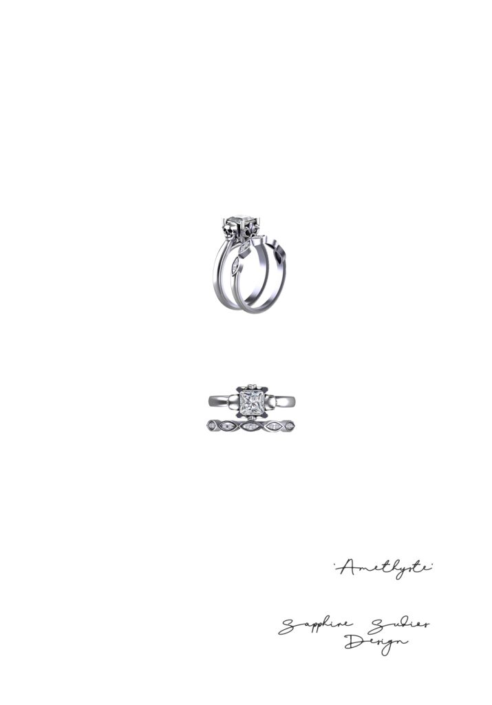 With a 1 carat princess-cut centre stone, this ring is framed by a mini skull on each side, symbolising “Until Death Do Us Part.” Delicate floral detailing with a gothic edge.