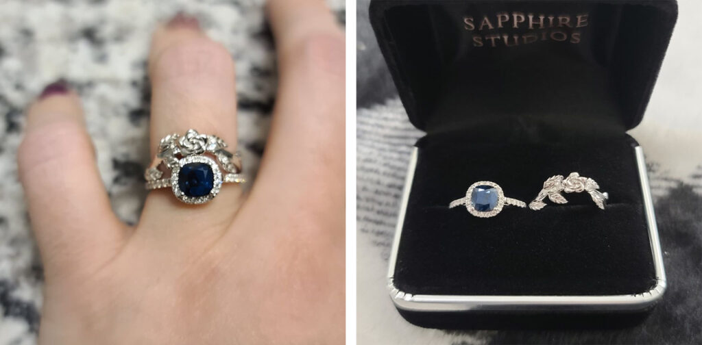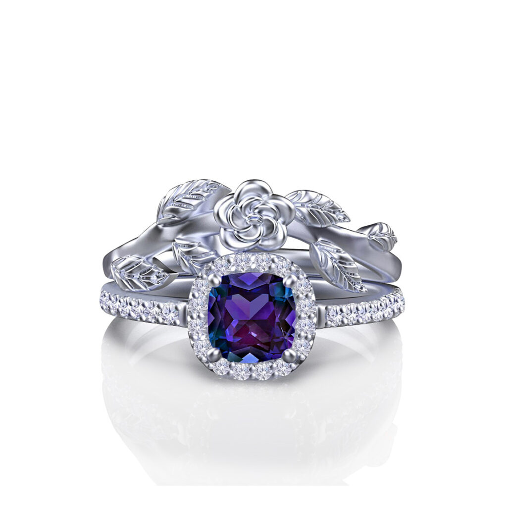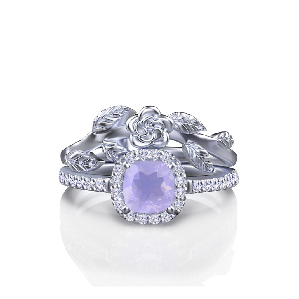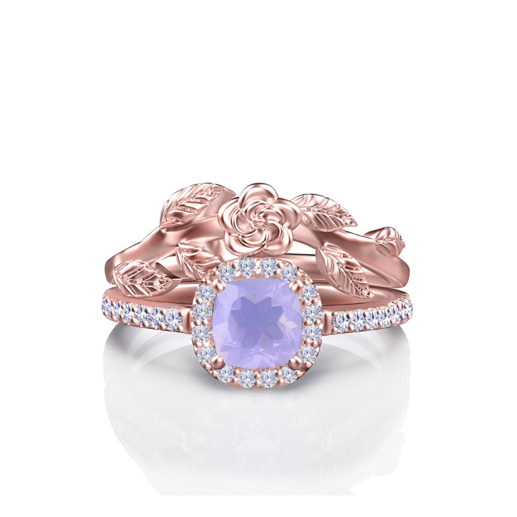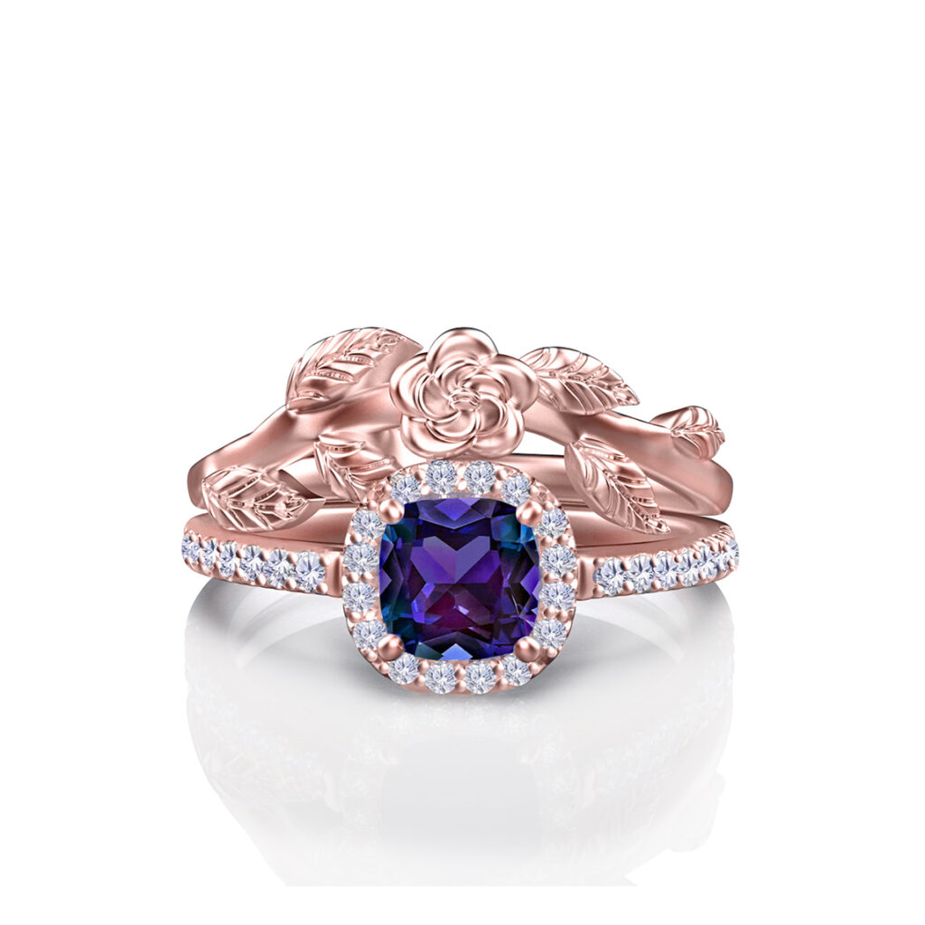 Together, they form a complete story making the perfect floral engagement ring set. Available in your choice of metal and stones.