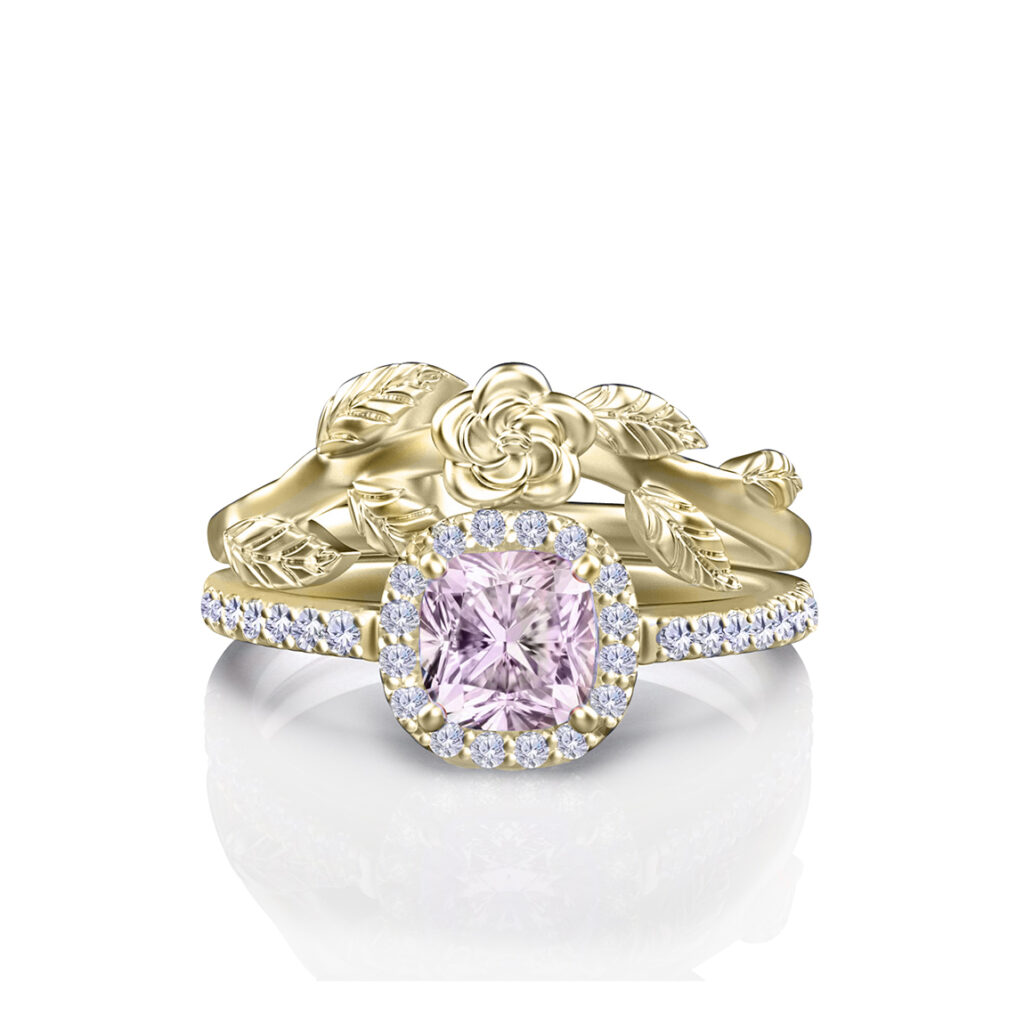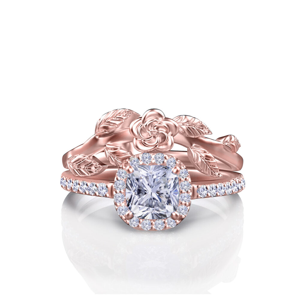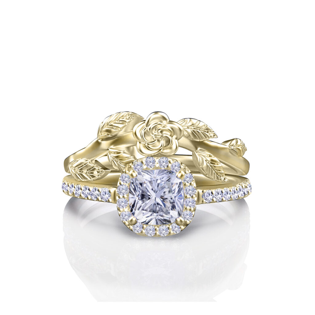 With a blend of nature and romance, Aviana features a cushion-cut centre stone framed by a halo of stones. The optional matching floral band blooms with sculpted roses and detailed leaves.
