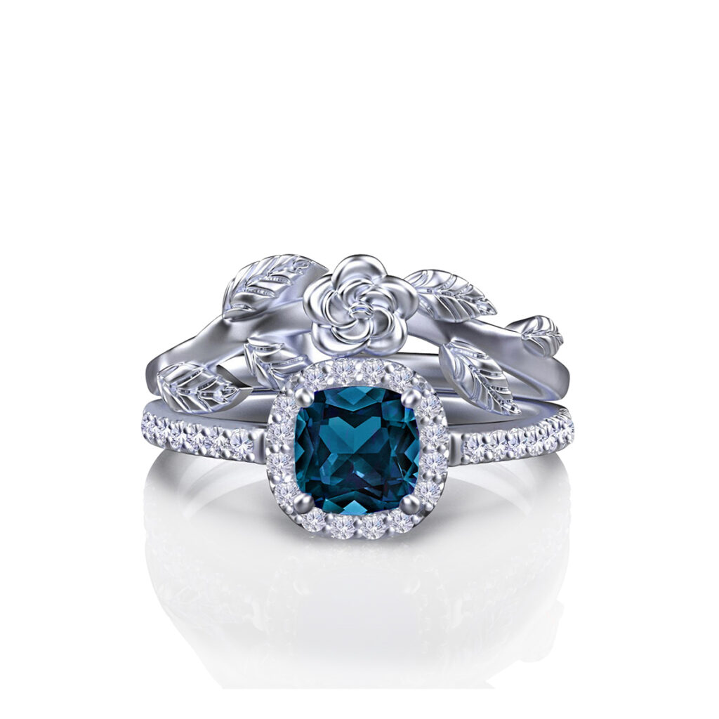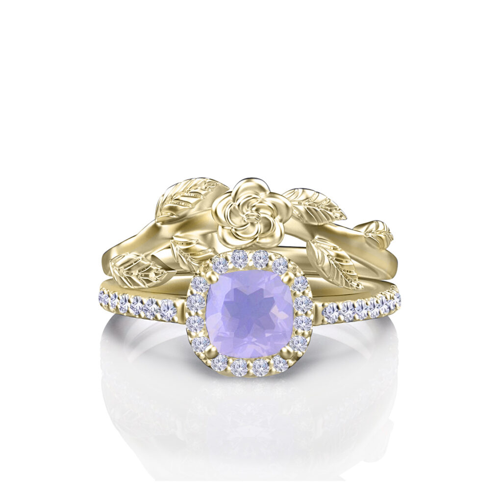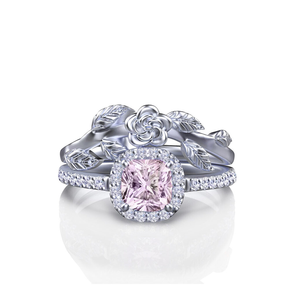 With a blend of nature and romance, Aviana features a cushion-cut centre stone framed by a halo of stones. The optional matching floral band blooms with sculpted roses and detailed leaves.