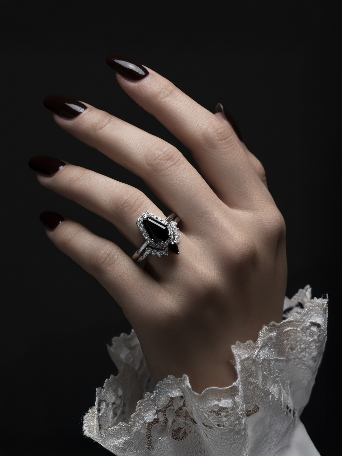 Created black + white stones, (Centre small pear cut black + white stones)