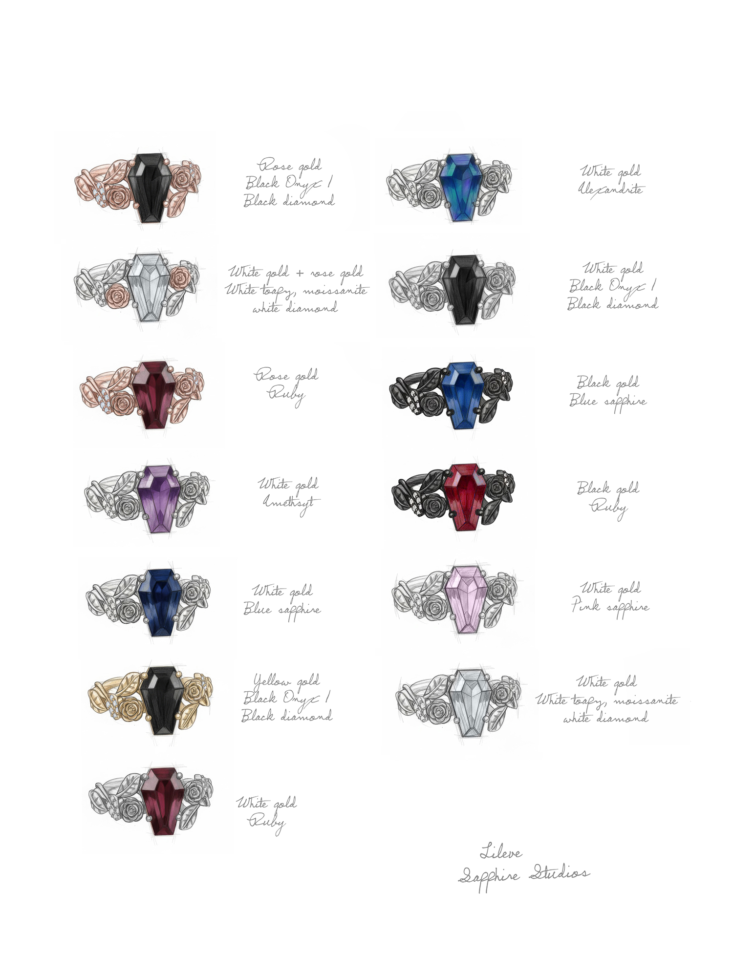 I ordered a lileve ring with an alexandrite stone and I absolutely adore it. The design of the ring is detailed and shows fantastic craftsmanship. The coffin cut is beautiful and unique (I say that because when I looked up coffin cut jewelry theirs is the best cut by far). Even my mom, who is not a fan of anything gothic, thought the cut/ring was lovely. Any emails I sent in regards to my order received a timely And polite response. Any jewelry lover looking to treat themselves OR Anyone looking for the perfect wedding/engagement ring should look into this company (Especially since they do custom designs)! It is a ring I will wear often and I look forward to my other orders!
