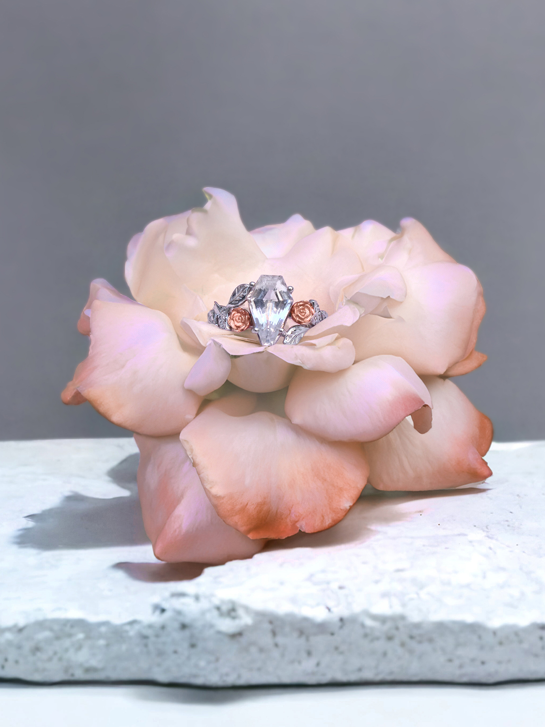 Crafted with the highest attention to detail, Lileve is available in our signature two-tone white gold with rose gold roses or your choice of metal.