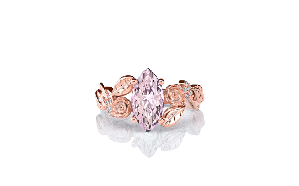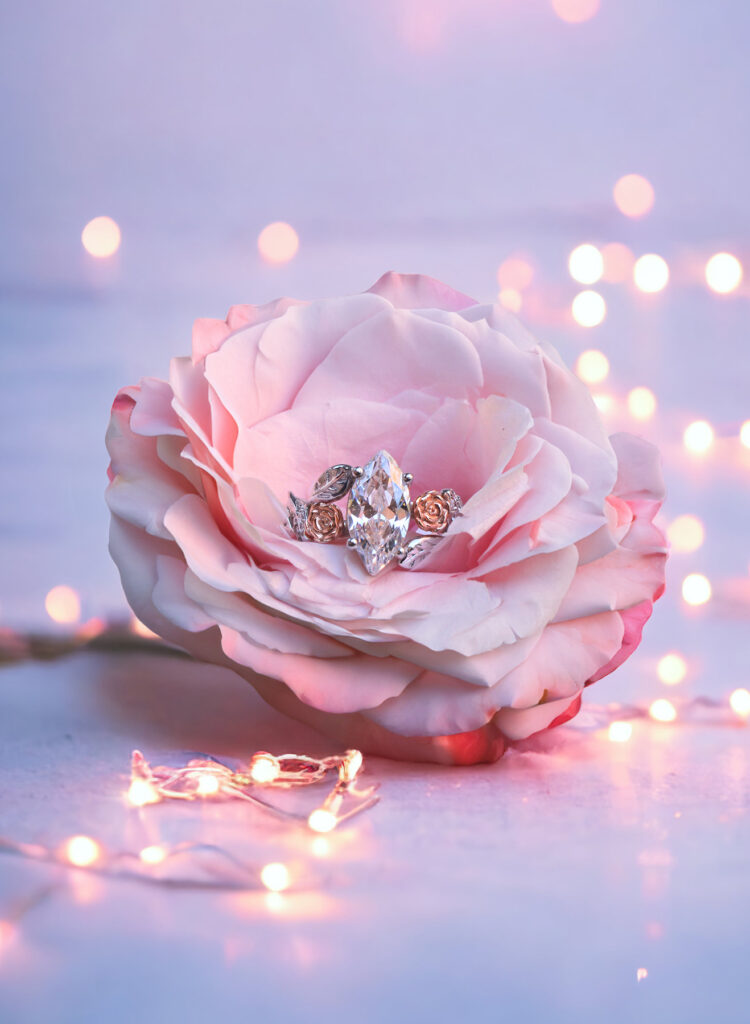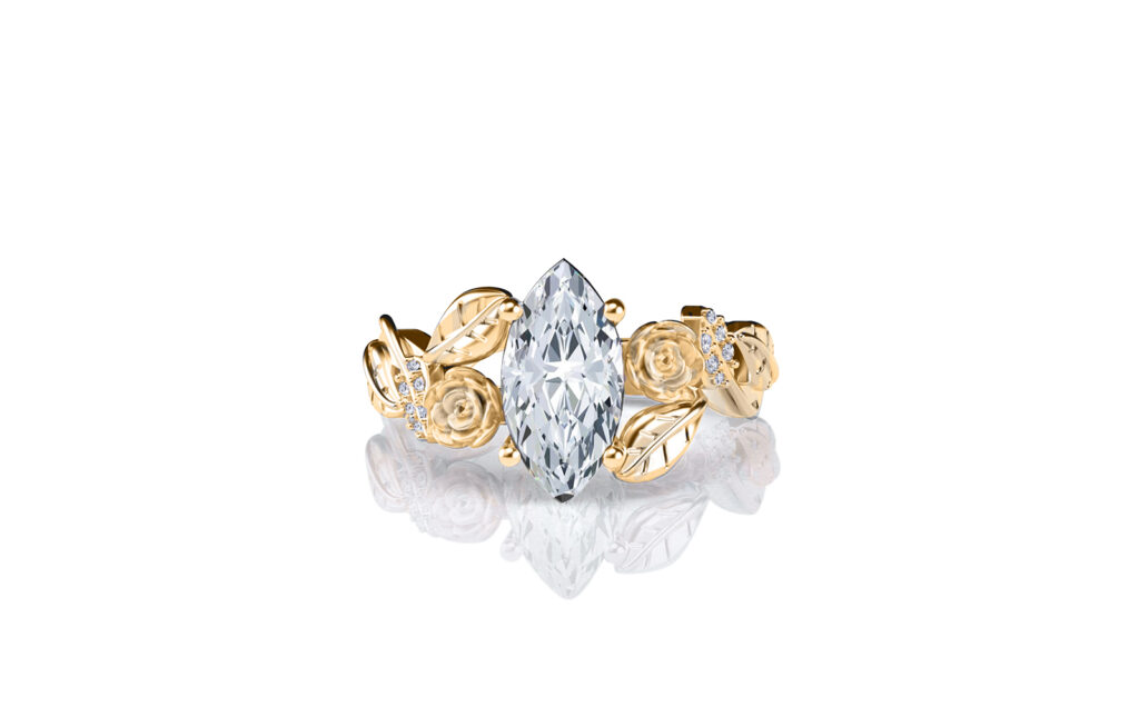 ‘Lylah Rose’ set with a 1.50 carat centre marquise surrounded by individually carved floral roses, entwined leaves, vines and cascading natural diamonds.