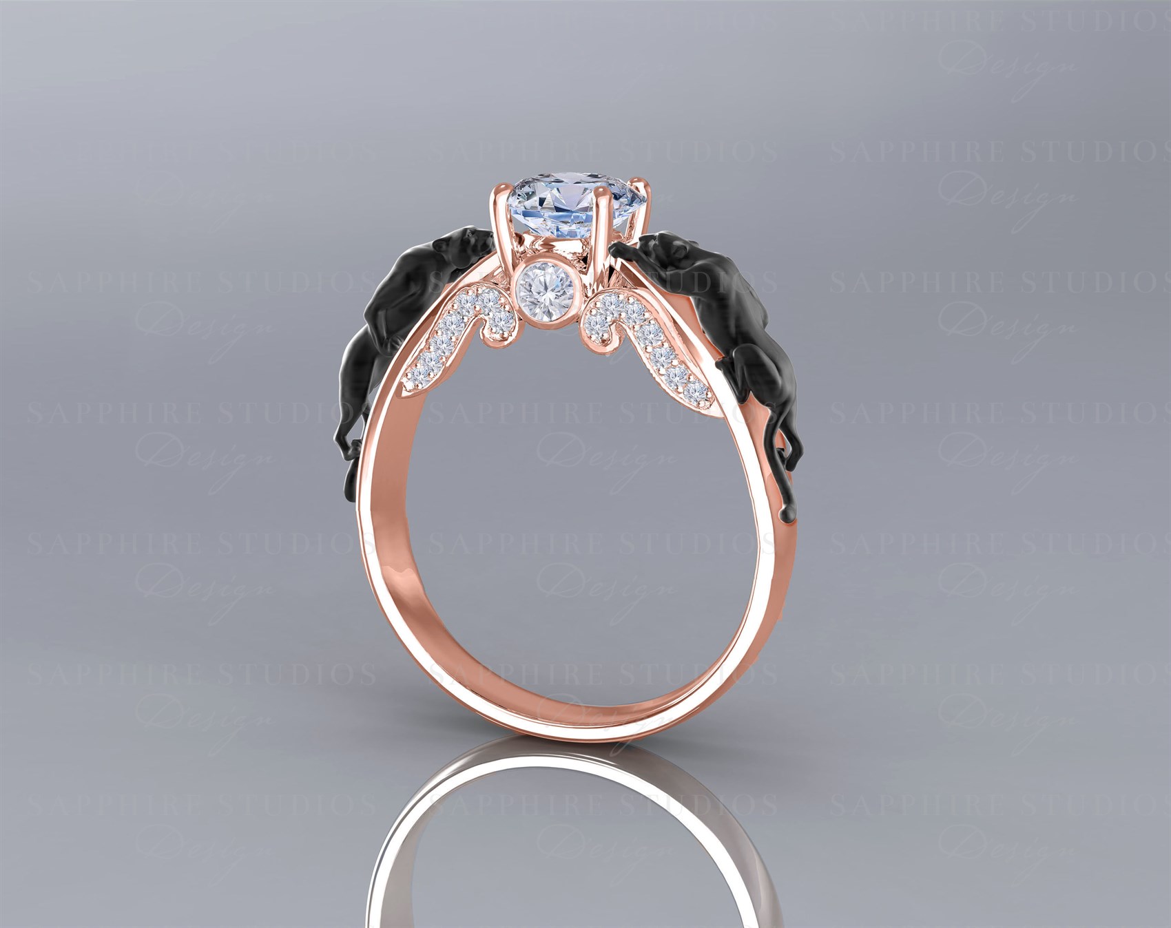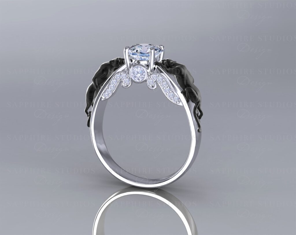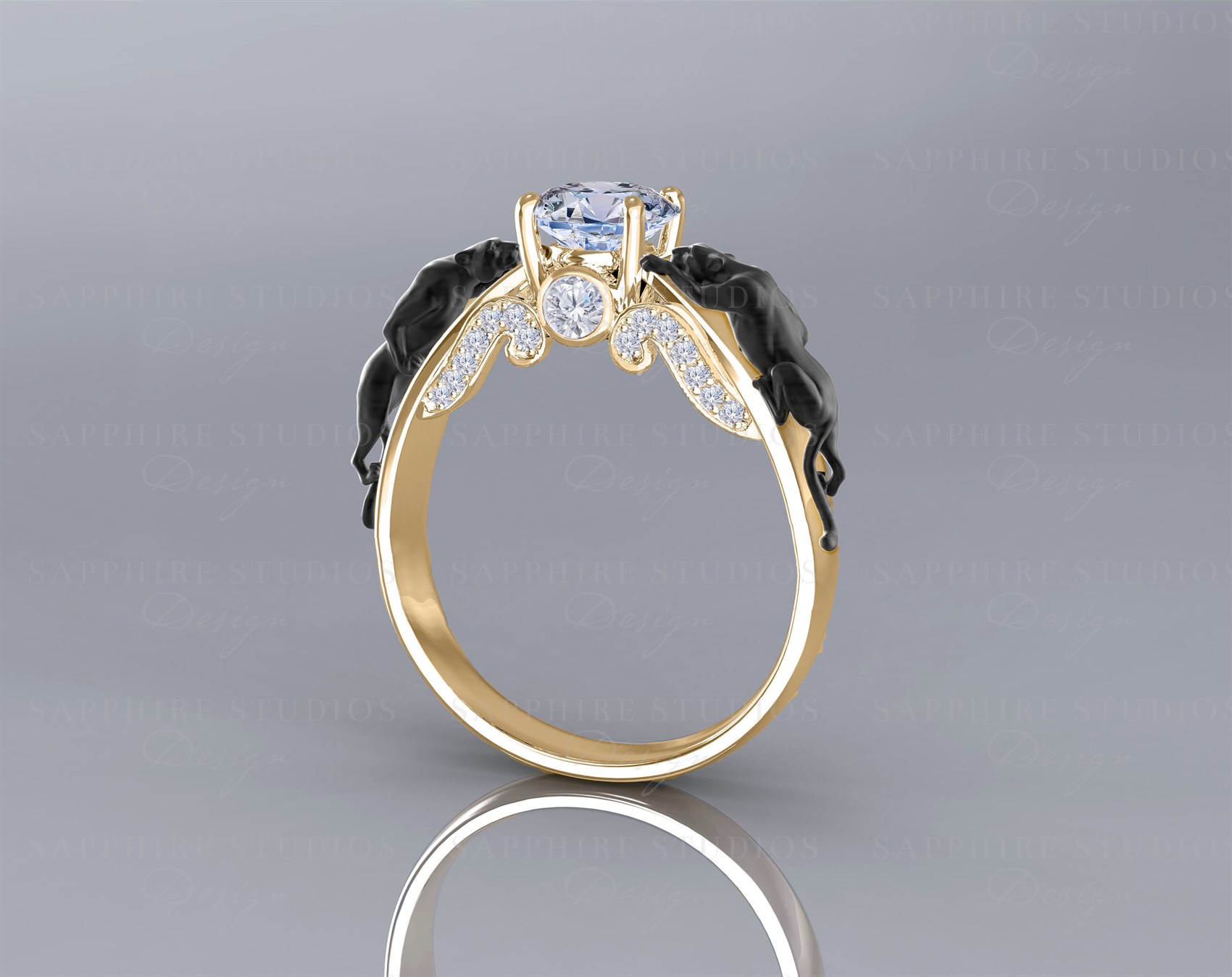 On each side, the panthers are depicted in a prowling stance. Between them, delicate pavé detailing rises in graceful sweeps. This detail forms wing-like curves that soften the intensity of the panthers. At the centre of these curves sits a brilliant accent stone, elegantly framed beneath the main centrepiece.