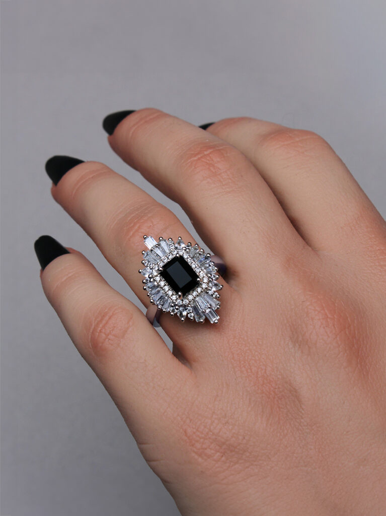 The Art Deco influence is evident in the geometric precision of the halo stones.