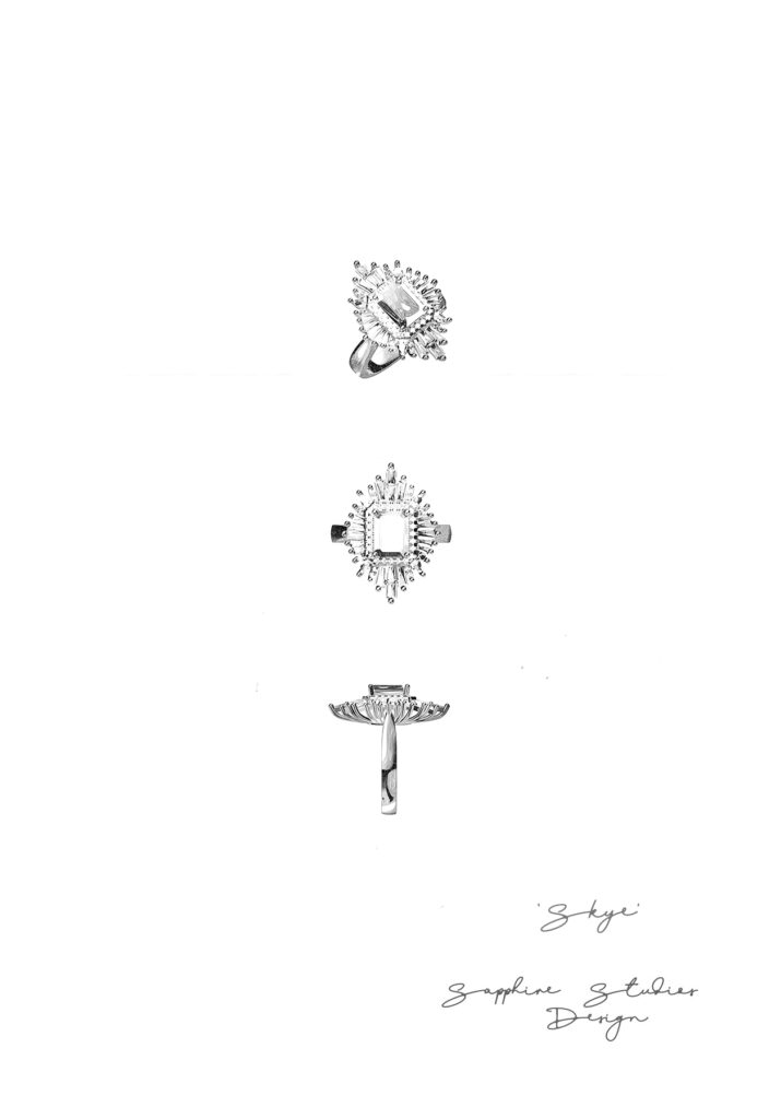 With an emerald-cut centre surrounded by a starburst halo of baguette, round and pear-cut stones.
