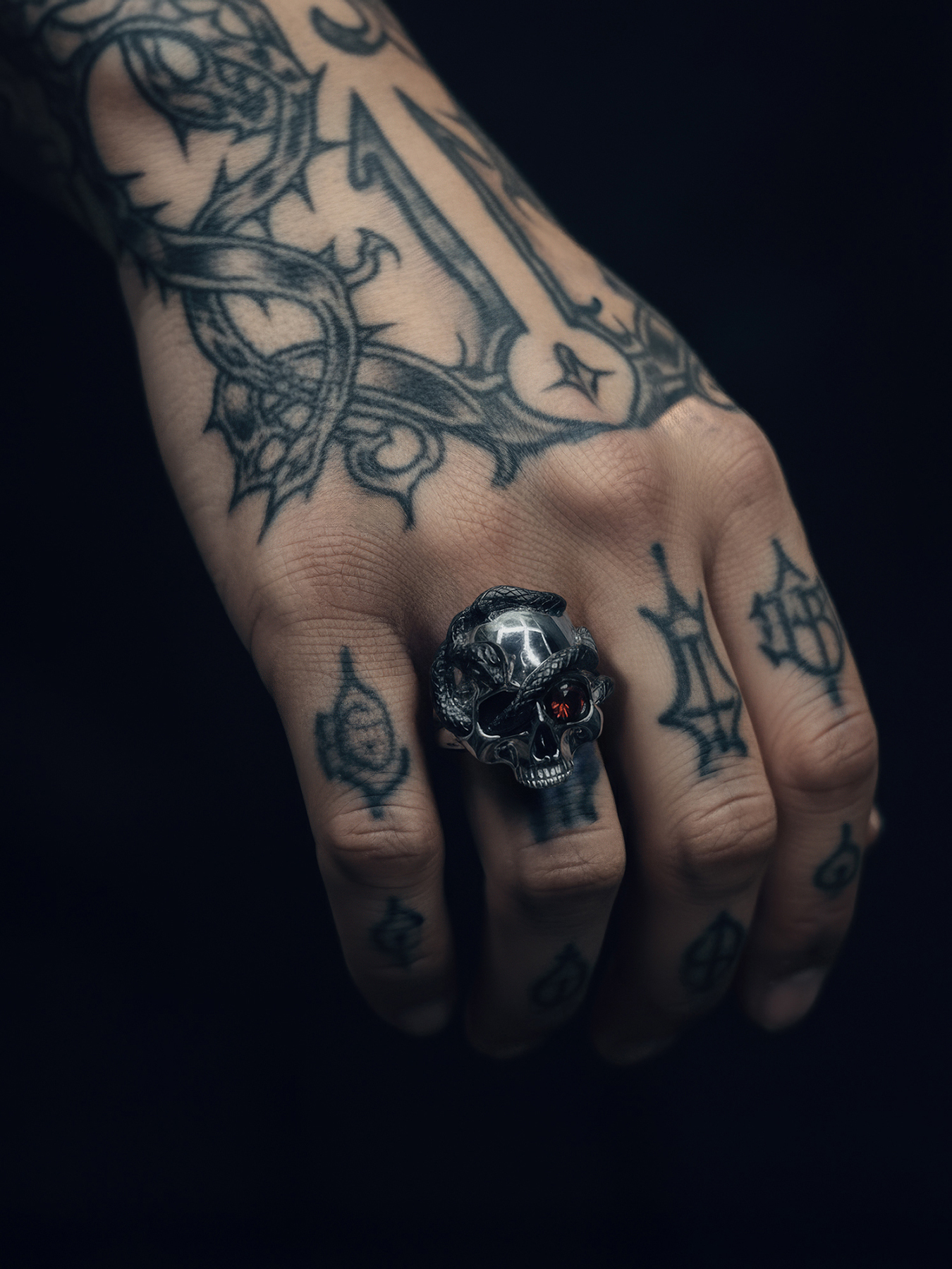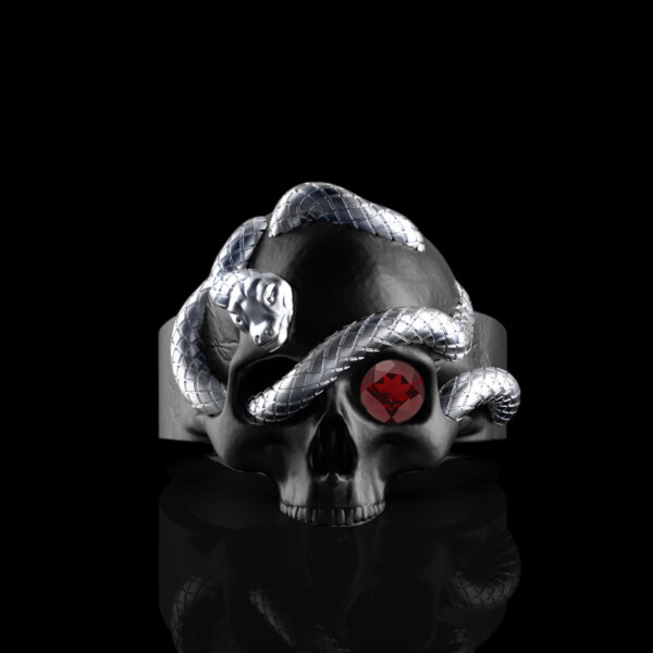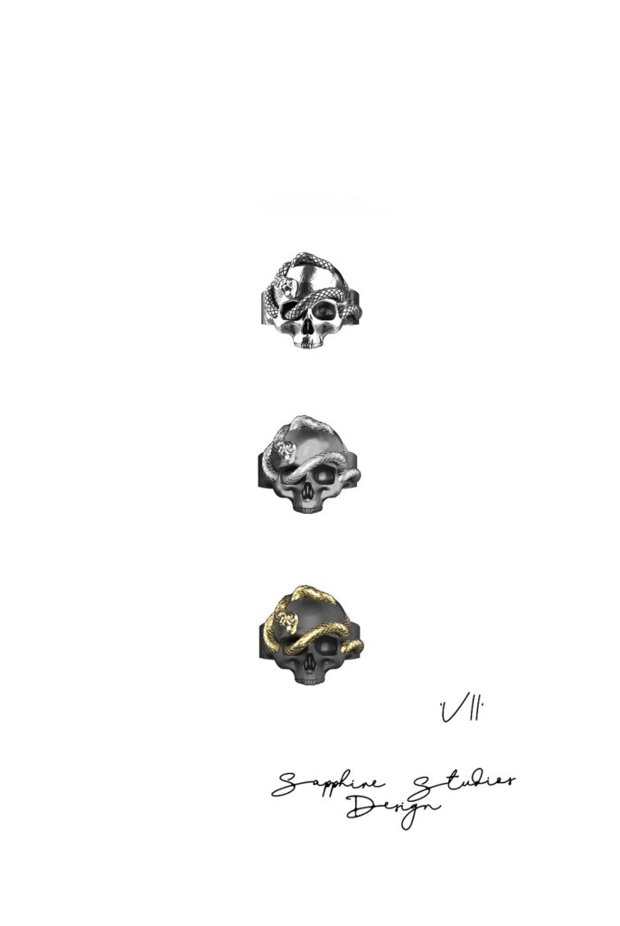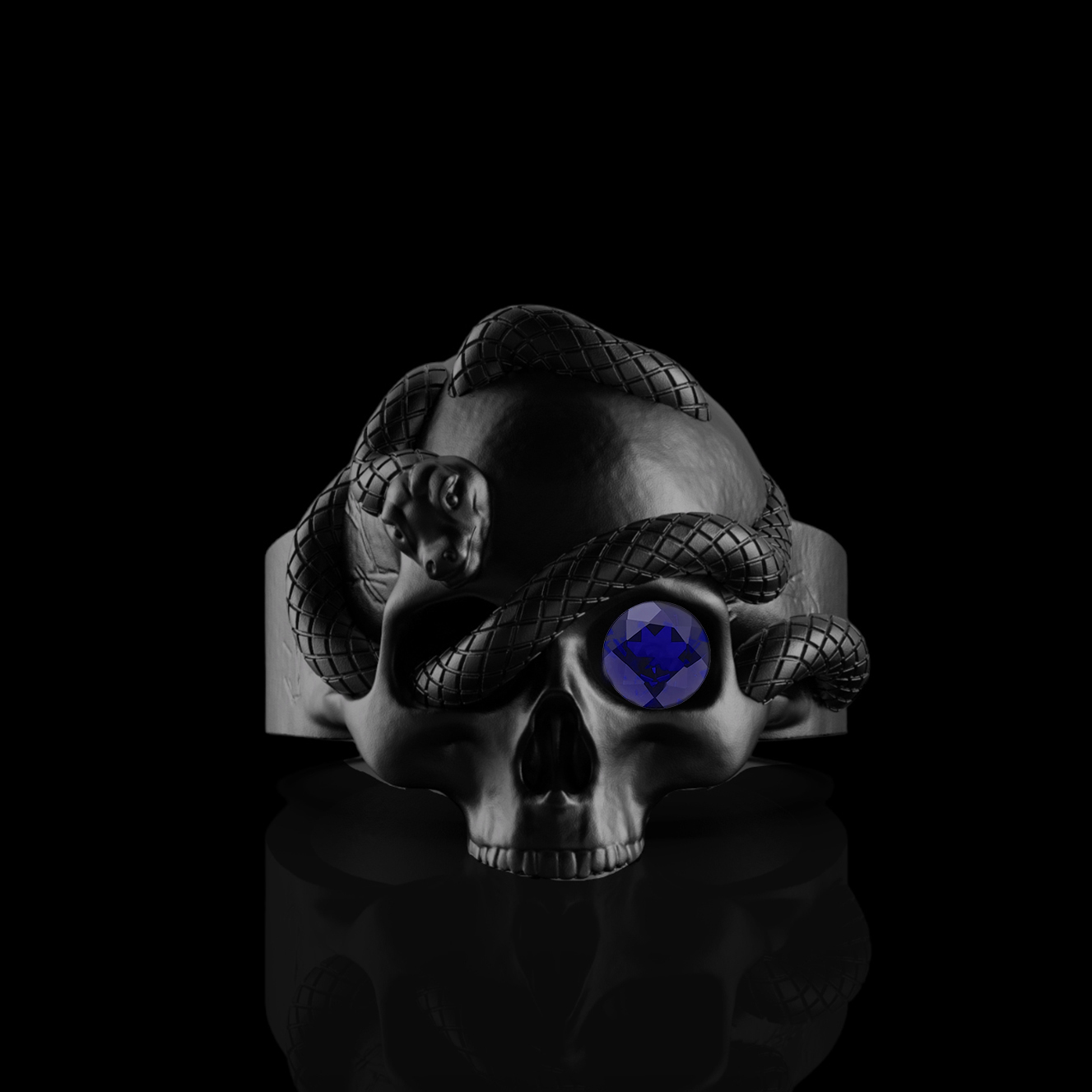 The VII men's skull ring features a sculpted skull encircled by a detailed snake that coils with precision around the design. Each scale and contour is finely casted to create realistic depth and texture. This can be set with or without a gemstone into the eye socket, adding a defined focal point.